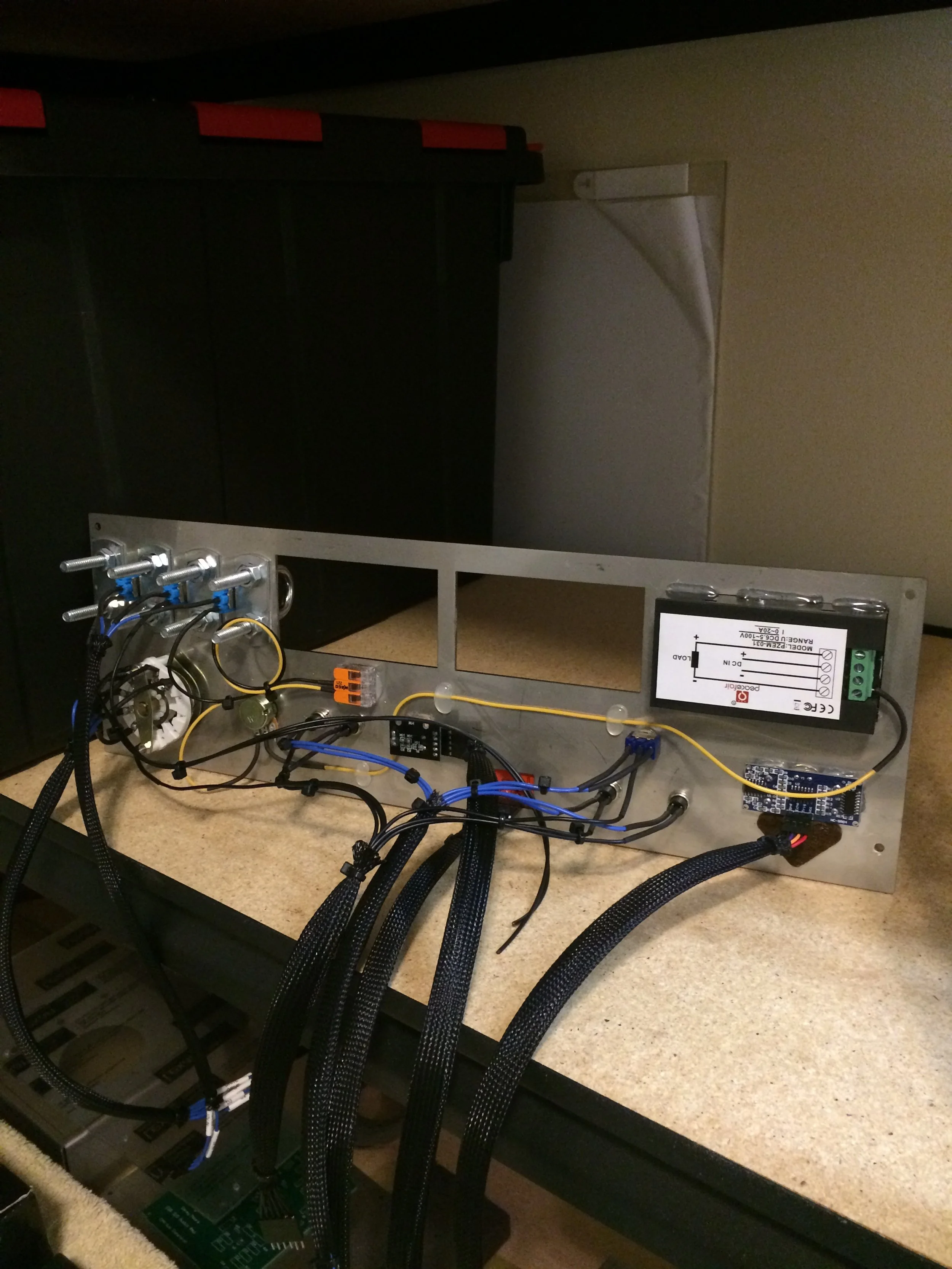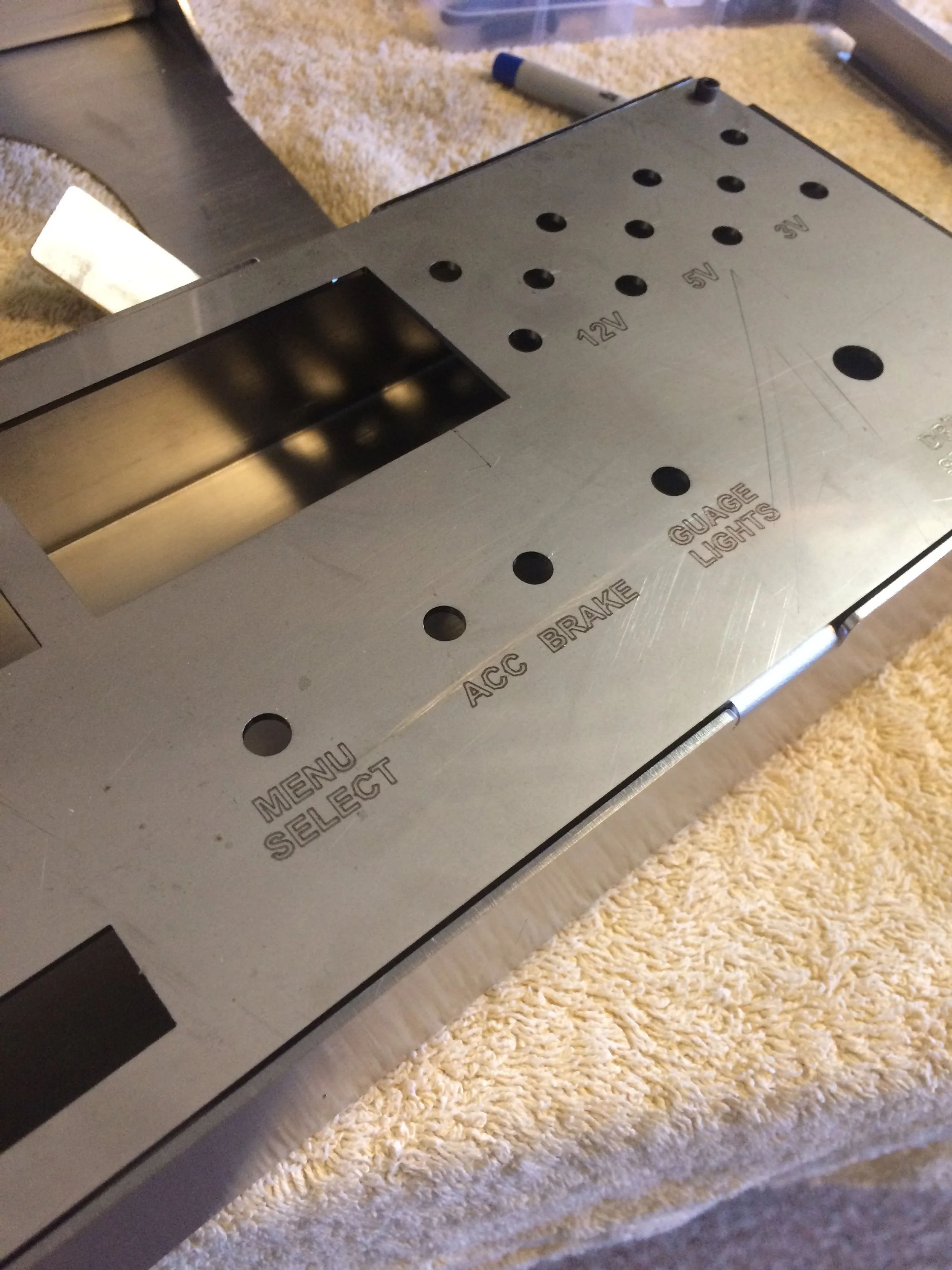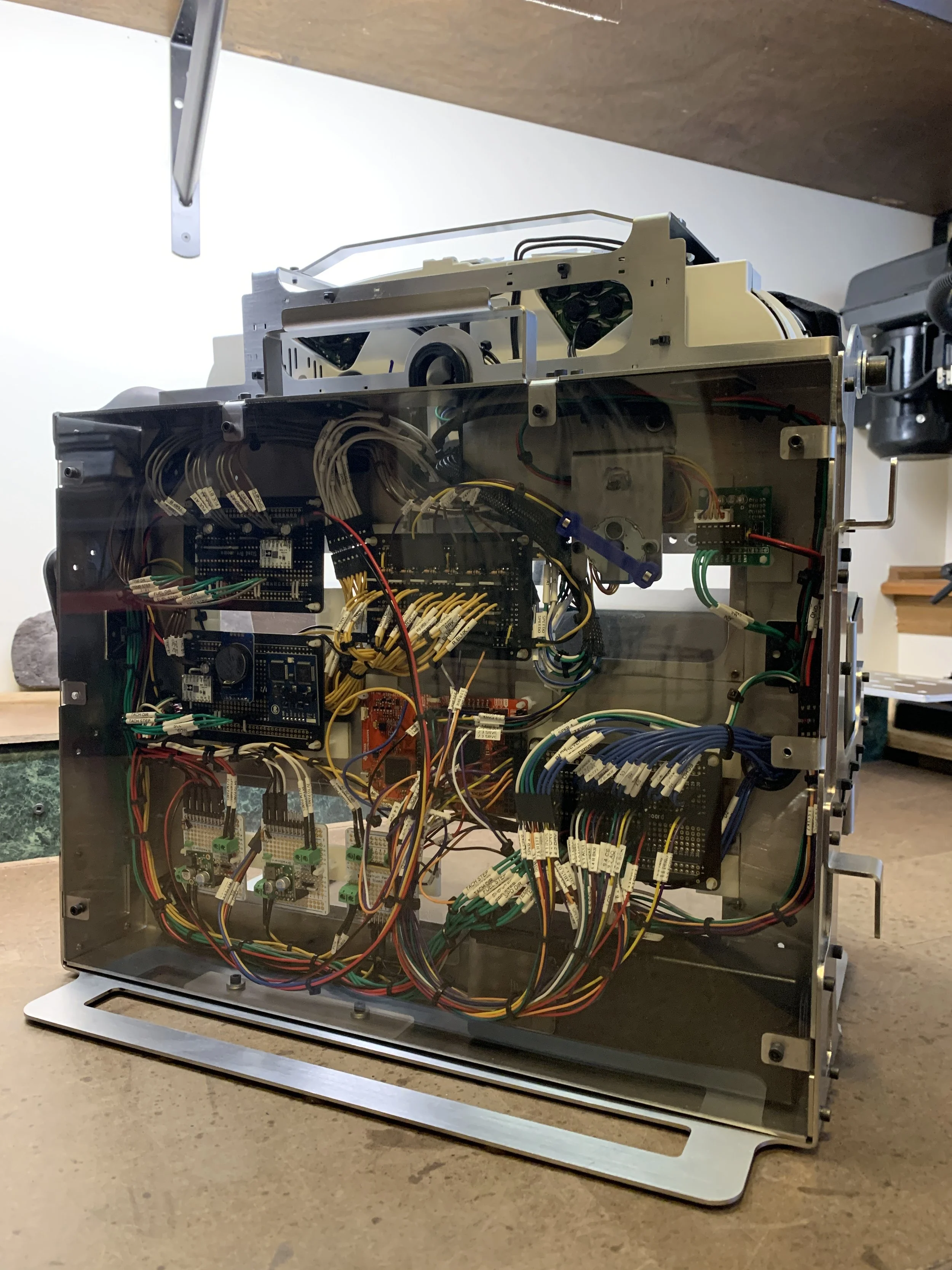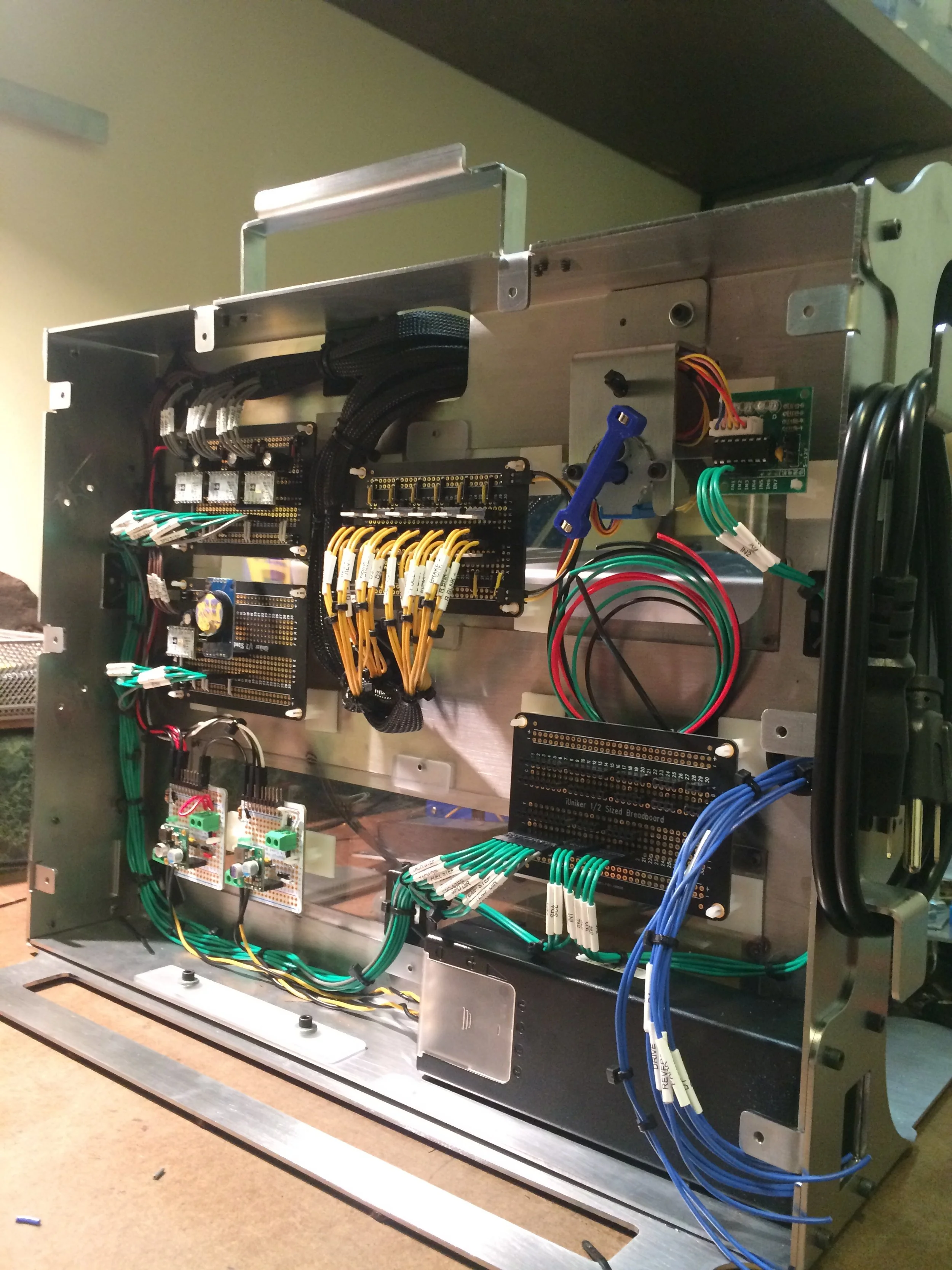 The enclosure was laser cut from 316 stainless steel and formed using a press brake. Each subassembly was secured using threaded holes and fasteners. The rear panel was made from clear polycarbonate in order to view the electrical components of the project.