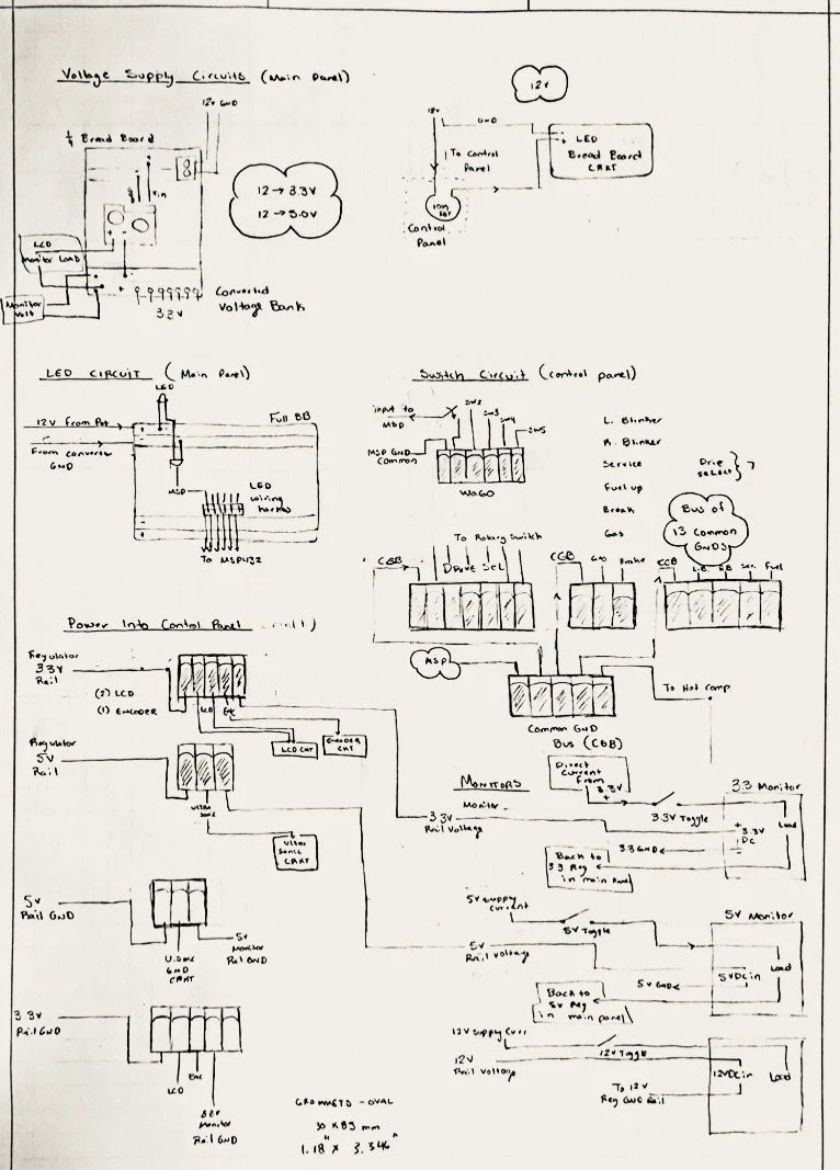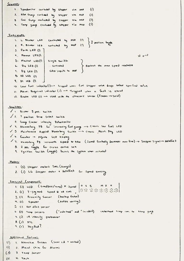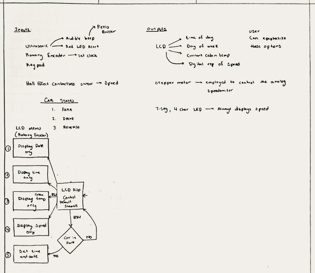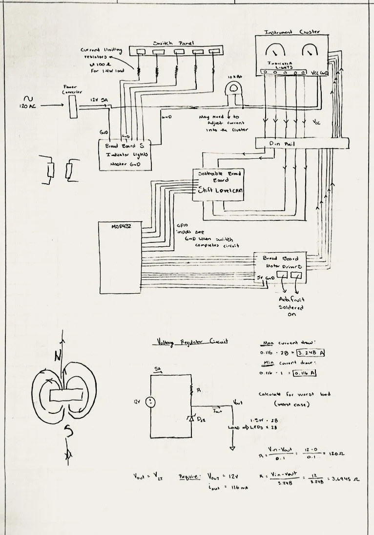 The system to be designed and built this term is an automotive style dashboard. The heart of your system is your TI MSP432 Launchpad microcontroller board. It interfaces with a real time clock IC and several sensors that comprise the Dashboard system. Combined with some pushbutton switches, analog sensors, two stepper motors, a rotary encoder, and a display, you will design and build a prototype to evaluate usability and feasibility of desired features of the customer.