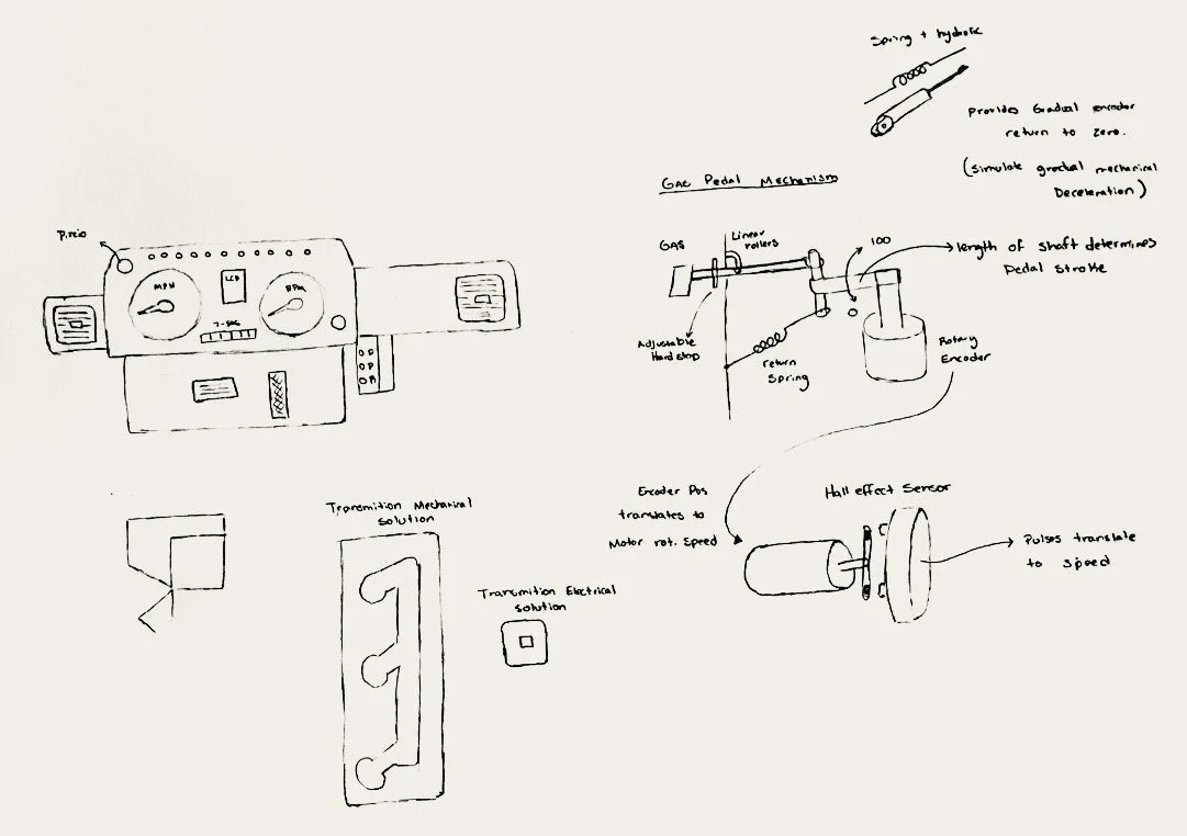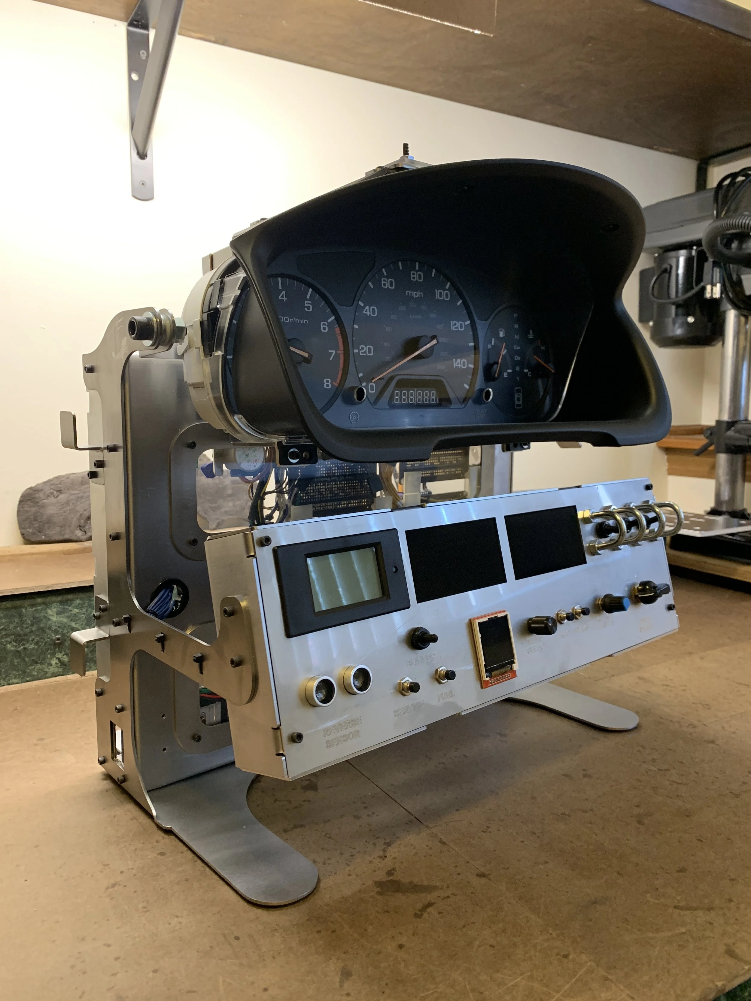 A free standing automotive gauge cluster. Users can interact with the components of the gauge cluster via the control panel on the front and have access to different features depending on what drive mode they have selected.