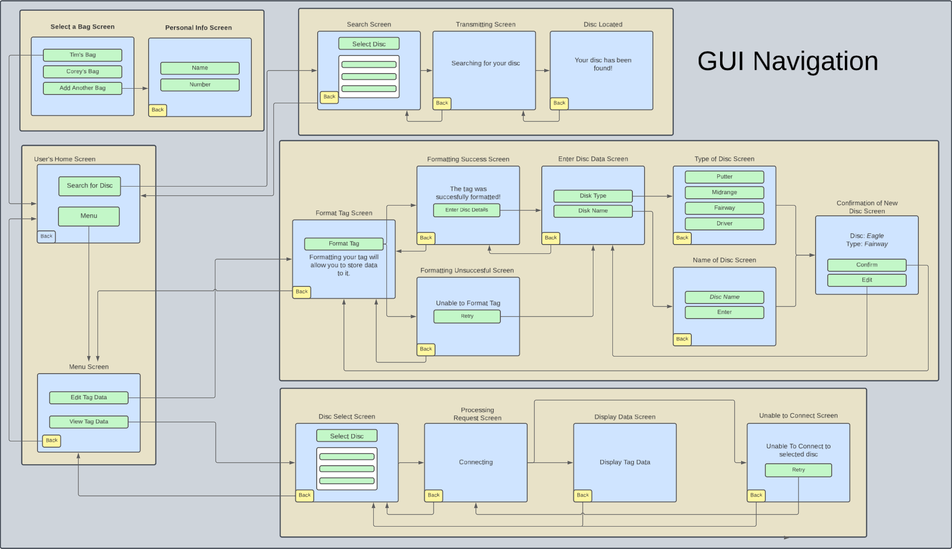 The GUI is a menu based design allowing the user to perform 3 main tasks: search for a disc and edit and view the data stored on a tag.
